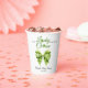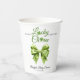 Lucky charm sage green bow with green clover St. Patrick's Day Irish girl baby shower paper cup. Celebrate the upcoming arrival of your little lucky charm with this adorable St. Patrick's Day-themed baby shower paper cup! An elegant sage green coquette bow, decorated with bright green clovers, adds a touch of Irish whimsy. There also is the text "A little Lucky Charm is on the way," using shamrocks to replace two letters and set a joyful mood.