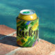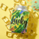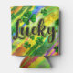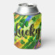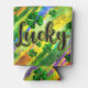 This vibrant can cooler features a colorful, streaked background with shades of green, yellow, orange, and blue. The word "Lucky" is prominently displayed in bold, black, glittery letters. Surrounding the text are multiple green shamrocks and sparkling yellow stars, adding a festive and cheerful touch. This design is perfect for celebrating St. Patrick's Day or bringing a bit of luck to any occasion.