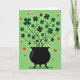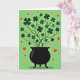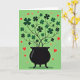 This card shows a matte black cauldron centered on a glowing lime-green background, as if it’s quietly brewing a lucky surprise. From the pot, slender vines rise and curl upward, carrying dark green four-leaf clovers that spread out with a gentle, balanced flow. The clovers are edged with a soft chartreuse glow, giving them a tender, close-knit look, like they’re leaning toward each other in a shared moment 💚. Small red hearts and a few pale pink orbs drift across the scene, adding a cozy hint of romance and friendship without taking over the main design ☘️. The greeting text sits near the top in a bright, light-colored green that stands out against the deeper green field. A smaller line of text appears near the bottom in a matching light tone, keeping the layout easy to follow. A faint highlight traces the cauldron’s rim while the scattered hearts and pink dots float across the green space around the climbing clovers.