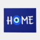 Colourful doormat in Mediterranean blue, with the word HOME written in a modern white font. The letter O is replaced with the lucky Evil Eye symbol. This well-known symbol is regarded as a lucky charm or talisman. Perfect as a housewarming gift, to wish them good luck in their new home.