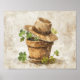 This artwork is a charming and rustic still life featuring a weathered terracotta pot with vibrant green four-leaf clovers sprouting out, symbolizing good luck and fortune. A well-worn straw hat, possibly belonging to a farmer or gardener, is casually placed atop the pot, adding a touch of character and narrative to the scene. The background is textured and earthy, with warm, neutral tones that enhance the natural and organic feel of the composition. This painting exudes a sense of simplicity, warmth, and a connection to the earth, making it a perfect piece for those who appreciate the beauty of humble, everyday objects.