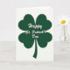 Designed with a large four-leaf clover centered on a bright white background, this St. Patrick’s Day card keeps the scene focused and easy on the eyes. The clover is a deep emerald green with a slightly uneven, textured fill that feels like it was drawn with care rather than stamped. Each leaf has a soft, heart-like curve, giving the shape a gentle, affectionate look that fits both friends and sweethearts 💚. Across the middle of the clover, the words “Happy St. Patrick’s Day” appear in white lettering that flows smoothly from left to right. The high contrast between the white text and the dark green clover makes the greeting stand out at a glance, like a note shared between two people close enough to read it together. With no extra objects in the background, the clover becomes the whole setting—simple, calm, and a little lucky ☘️. The stem angles downward from the clover’s base, and the four leaves meet neatly at the center under the white greeting.