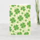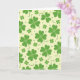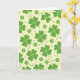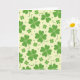 This greeting card features a repeating pattern of four-leaf clovers scattered across a pale yellow background, like a sunny meadow seen through a soft filter. The clovers are lime and leafy green with heart-shaped leaves, and a few include curling tendrils that loop near neighboring shapes, as if they’re reaching out like close friends. Smaller four-petaled florets and muted green polka dots fill the open spaces, keeping the layout airy and gently rhythmic. Fine inner lines inside the larger clovers hint at natural veins, adding a quiet layer of detail without making the design feel busy. Near the top center, “Happy St. Patrick’s Day” appears in medium green lettering that stands out clearly against the warm backdrop. A tiny ☘️ sits close to the text as a small accent, while a second 💚 appears nearby to echo the clover theme. Across the surface, the greens stay consistent and smooth, and the pale yellow background remains even behind the scattered clovers and dots.