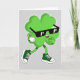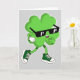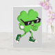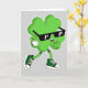 This card features an anthropomorphic four-leaf clover centered on a muted gray background, glowing in rich emerald green with an upbeat, mid-step pose ☘️. Its heart-shaped leaves form a friendly face, topped with sleek black sunglasses marked by small white highlights that add a flirty, “I noticed you” kind of confidence. Below the shades, a wide open smile shows bright white teeth, giving the character an inviting, buddy-next-door charm 💚. Slim, segmented green arms and legs lean forward like it’s heading your way, as if strolling up to meet a friend for a laugh. One white-gloved hand rests on its hip while the other swings back, suggesting a carefree walk that feels like a casual hello. Dark green high-top sneakers with white laces, toe caps, and thick white soles lift one foot as though it’s dancing across the page. There is no text on the front, leaving the clover as the clear focal point with a soft shadow trailing behind it on the gray backdrop.