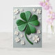 This card features a large four-leaf clover centered on a cool grey background, its emerald green leaves shaped like soft hearts that lean toward each other like close friends 💚. Each leaflet has a gentle sheen and clear veins, giving it a sculpted look without feeling stiff. Around the clover, small white four-petal blossoms float in different sizes, like little notes of affection scattered nearby ☘️. The flowers have a smooth, porcelain-like surface, and each one holds a tiny golden-yellow stamen that adds a warm spark to the cooler scene. Soft, diffused light falls across everything, creating faint, stretched shadows that make the clover and blooms seem to hover just above the surface. The greeting “Happy St. Patrick’s Day” sits near the top in green lettering, with a smaller line beneath it in light grey that feels quietly intimate. The final look is a centered emerald clover surrounded by white blossoms with yellow dots, all set against a calm grey field with delicate shadows.