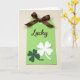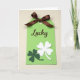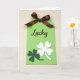 This card shows a vertical tag centered on a bright lime green background, giving the whole scene a fresh St. Patrick’s Day look 💚. At the top, a dark chocolate-brown satin ribbon is tied into a neat bow, its soft shine standing out against the matte paper. Just below the bow, the word “Lucky” appears in flowing brown lettering, placed near the upper third so it feels like a gentle greeting. Farther down, two four-leaf clovers overlap like a close pair leaning into each other, suggesting a sweet bond between friends or partners ☘️. The bottom clover is a deeper forest green, while the one on top is white, creating a layered effect with a slight sense of depth. Soft, even lighting keeps the edges crisp and the colors smooth, with no harsh shadows. The composition stays simple and tidy, with the bow above, the brown “Lucky” centered below it, and the stacked clovers near the lower half of the tag. The lime green field, brown bow and lettering, and the white-over-green clovers form a clear, balanced arrangement from top to bottom.
