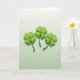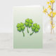 This card shows three stylized four-leaf clovers arranged in a loose row on a pale green background that softly shifts from mint to a gentler green. Each clover has plump, heart-shaped leaves that meet neatly in the center, giving them a sweet, almost affectionate look, like close friends leaning in together 💚. The greens range from light lime highlights near the top to deeper emerald shading along the curves, adding a rounded, softly lit feel. A dark outline traces every leaf and stem, making the shapes stand out clearly against the quiet backdrop. Under each clover, a faint gray shadow sits close to the base, suggesting a slight lift from the surface. There’s no scenery beyond the gradient field, which keeps the focus on the trio and their cozy togetherness ☘️. No headline appears at the top, and there’s no message text along the bottom or sides. The only marks are the three clovers, their dark outlines, and the small gray shadows beneath them on the mint-to-green gradient.