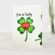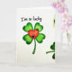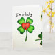 This card features a crisp white background with a large four-leaf clover painted in soft green washes and edged with a thin black outline ☘️. At the clover’s center sits a bright red heart, and two tiny black figures peek out from inside it as if sharing a private, affectionate secret. Their close, tucked-in pose suggests a sweet bond, like friends leaning together or a couple stealing a quiet moment. Above the clover, the words “I’m so lucky” curve in a casual, hand-drawn black line, centered and easy to read. The simple layout leaves plenty of open space around the main image, giving the clover and heart room to stand out 💚. Subtle shifts in the green paint add a natural, watercolor texture across each leaf. On the right edge, a second clover is partially visible, cropped so only a few green leaves and black outlines show.