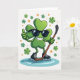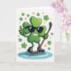 This card features an upbeat four-leaf clover character in rich green tones, standing confidently on a sheet of bright blue ice with a cool grin and black sunglasses. One leafy arm gives a thumbs-up while the other holds a wooden hockey stick, as if it’s ready to skate in and show off for a friend 💚. The clover wears black ice skates with shiny silver blades that catch hints of the blue beneath, adding a slick, frosty shine. Around the main figure, smaller clovers drift like lucky confetti alongside small orange stars, giving the scene a friendly, flirty sparkle ☘️. The background stays white and open, keeping all eyes on the central skater and its confident pose. A St. Patrick’s Day greeting sits near the top in green lettering, with a shorter line of text near the bottom in orange to match the stars. The illustration uses smooth shading on the clover leaves, and the ice is drawn as a rounded blue patch under the skates.