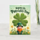 This greeting card features a cheerful leprechaun centered in the scene, smiling wide with rosy cheeks and a full orange beard that stands out against his emerald suit and tall green hat. Small golden buckles on his outfit add a warm gleam, like he’s dressed up to charm a friend or sweeten a shared holiday moment 💚. Above his head sits a large four-leaf clover with rounded, cushioned-looking jade leaves, giving the layout a lucky focal point. Around his boots, stylized green grass mixes with golden-yellow flowers, and the way they cluster near him makes the foreground feel welcoming and close. The background fades from soft spring green into sunlit amber, with tiny green and gold confetti specks scattered like little stars ☘️. The words “Happy St. Patrick’s Day” curve in an arch above the clover in thick, rounded lettering, set in a dark green tone that stays easy to read. A gentle glow across the illustration highlights the leprechaun’s open expression and the clover’s rounded shapes. The clover sits near the top center, the text arcs above it, and the grass and flowers form a bright base along the bottom edge.