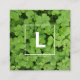 St. Patrick's lucky shamrock. Green nature, green clover with monogram, morning dew meadow, personalized letter, gardener design