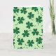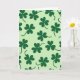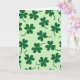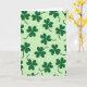 This card features an all-over pattern of three-leaf clovers scattered across a soft mint-green background, like a gentle meadow seen up close. The shamrocks are a deep emerald shade with slight shading inside each leaf, giving them a tender, rounded look that feels inviting 💚. Their thin, curving stems sweep in different directions, as if they’re quietly reaching toward one another the way close friends do. The arrangement repeats seamlessly, but each clover sits with a natural looseness, so the field feels easy and unforced rather than rigid. Lighting stays even and calm, keeping the scene smooth and airy, like a cool spring morning ☘️. There’s no central character scene—just this steady, affectionate rhythm of greenery that suggests togetherness through repetition and closeness. Any greeting text would sit neatly over the pattern in a darker green for contrast, but the artwork itself shows only clovers on mint. In every direction, the emerald shamrocks and their flowing stems continue across the frame on that pale green backdrop.