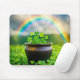 Green four-leaf clovers in an old black kettle in a clover field with a rainbow