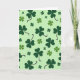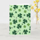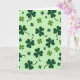 On the front of the card a pale mint-green background sets a calm spring setting, covered edge to edge with clovers in several shades of green. Larger forest-green shamrocks stand out with three heart-shaped leaves and thin black stems that curl gently, like they’re leaning in toward one another in a quiet, friendly way 💚. Between them, smaller lime-green four-leaf clovers add bright little surprises, and a few tiny darker-green four-leaf shapes sit like scattered specks across the pattern ☘️. The layout has no single center, so your eyes drift around the page as if strolling together through a field of lucky leaves. A St. Patrick’s Day greeting sits near the top in dark green lettering, with a shorter sign-off line placed near the bottom in a lighter green for contrast. The mix of greens—soft in the background and deeper in the leaves—creates gentle depth without crowding the page. The pattern repeats with heart-leaf shamrocks and four-leaf clovers spaced evenly across the mint backdrop, with curving black stems threading between them.
