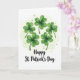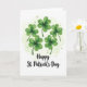 This card shows five four-leaf clovers gathered like close friends, their heart-shaped leaves touching in a loose cluster that feels quietly affectionate 💚. Each clover is painted in watercolor greens that shift from deep emerald near the center to a lighter, airy green along the rounded edges. Fine veins and soft texture make them look freshly picked, as if someone just leaned in to share a lucky find. Behind them, a gentle light-green wash ripples outward, creating a calm setting with a few darker green splatters for energy ☘️. The rest of the background stays bright white, giving the clovers plenty of space to stand out. Along the lower area, the words “Happy St. Patrick’s Day” appear in dark green, flowing lettering that anchors the open space beneath the cluster. The clovers sit slightly above the text, framed by the pale green wash and scattered speckles on the white page.
