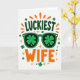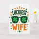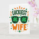 This greeting card features a bright white background with the words “LUCKIEST WIFE” centered like a proud toast between partners 💚. “LUCKIEST” sits on the top line in deep emerald green, while “WIFE” anchors the bottom line in warm orange, giving the lettering a confident, affectionate balance. Between the two lines, a pair of green sunglasses becomes the focal point, hinting at a couple’s shared joke and easy closeness. Instead of regular lenses, two four-leaf clovers fill the frames in a lighter green, as if luck is what they see when they look at each other ☘️. Small clovers of different sizes float around the main design, adding movement without crowding the center. Orange burst shapes and tiny four-point stars sprinkle the space, like little sparks around the message. The green frames are slightly outlined for depth, and the scattered icons sit evenly across the white space with crisp edges and tidy spacing.
