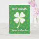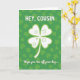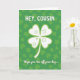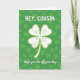 This design shows a large four-leaf clover centered on the card, drawn in bright white with a lime-green outline that makes it stand out against a deep green background. Behind it, soft, out-of-focus shamrocks fill the scene like a leafy backdrop, creating a cozy St. Patrick’s Day setting with a gentle glow 💚. Inside each clover petal, small circles and curved lines add a sporty touch, like simple nods to golf, and they sit neatly without crowding the main shape. Near the top, “HEY, COUSIN” appears in rounded sans-serif letters in white, spaced evenly so it feels friendly and close, like a familiar voice across the room. Along the bottom, the phrase “Hope you tee off your day...” is set in matching white text, aligned to read clearly beneath the clover and tied to the little golf-like marks ☘️. The overall green palette shifts from forest tones in the background to brighter chartreuse accents, giving the scene a fresh spring look where the greeting feels like it’s meant for someone you genuinely enjoy. The central clover remains the focal point, with its four smooth leaves framed by the blurred shamrocks and the two lines of white text above and below.
