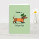 This card shows a long-bodied dachshund in profile on a pale pistachio green background, dressed up for St. Patrick’s Day with a friendly, ready-to-go look ☘️. The dog’s warm brown coat peeks out from an orange sweater, and its small smile and forward gaze feel like it’s trotting along beside you like a loyal pal. A green leprechaun hat sits on its head with an orange band and a gold buckle, adding a sweet, dress-up charm. Matching green sneakers with white soles give the pup a mid-step energy, like it’s keeping pace with someone it likes. Near the top, the words “have a” appear in small lettering, set above the dog in a darker green that stands out against the light background 💚. Along the bottom, “lucky day” is written in a flowing style, also in green, stretching beneath the dog’s feet. The simple layout leaves plenty of open space around the figure, while the hat buckle and shoe soles add crisp little highlights. The dachshund’s orange sweater, green hat, and green sneakers pop against the pale green field, with “have a” above and “lucky day” below framing the scene.