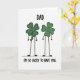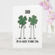 This card shows two four-leaf clovers drawn like little characters, side by side on a white background, their rich green leaves outlined in black and their stick-like arms and legs ending in small oval feet. Each clover has two dot eyes and a wide smile, and the way they lean slightly toward each other suggests an easy closeness, like a warm hug between friends or family. At the top, the word “DAD” sits centered in a rounded sans-serif style, printed in black for strong contrast. Along the bottom, “I’M SO LUCKY TO HAVE YOU” is set in the same black lettering, stretching neatly across the lower area beneath their feet 💚. The green fill includes a bit of texture, and the black outlines have tiny natural-looking wobbles that make the drawing feel intimate and human. One clover has a small curling stem detail that adds character, like a shy flourish between the pair ☘️. A faint, scribbly green line runs under them as a simple ground, with the two clovers standing just above it.