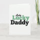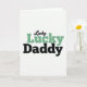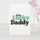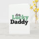 This greeting card features the phrase “Lucky Lucky Daddy” centered on a bright white background, with the first “Lucky” in a flowing black cursive style that floats above the rest like a soft introduction. Beneath it, the second “Lucky” sits larger and heavier in an earthy green, giving the layout a steady, grounded look that nods to St. Patrick’s Day ☘️. The word “Daddy” anchors the bottom in strong black lettering that matches the top line, creating a close, connected feel between the words, like a warm squeeze on the shoulder 💚. The stacked arrangement keeps everything neatly centered, with generous white space around the text so the message feels open and uncluttered. The contrast between the airy top lettering and the thick middle line adds a gentle rhythm, like two voices—one tender, one confident—sharing the same affectionate thought. The green “Lucky” is the only color accent, so it stands out without needing extra icons or decorations. All three lines are aligned down the middle, with black text on the top and bottom and the green “Lucky” forming the visual focal point in the center.