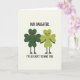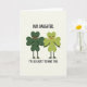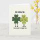 This card shows two friendly shamrocks standing close together on a creamy off-white background, their heart-shaped leaves forming simple, rounded bodies in two shades of green. One is a deeper emerald and the other a lighter spring green, and they lean toward each other with a closeness that reads like family affection. Their wide eyes, rosy cheeks, and open smiles create a gentle, caring look between them, as if one is proudly looking after the other 💚. Thin, stick-like arms and legs give them an easy, animated stance without adding clutter. Near the top, “OUR DAUGHTER.” appears in dark lettering, centered and easy to spot. Lower on the card, “I’M SO LUCKY TO HAVE YOU.” sits beneath the characters in the same dark color, balancing the layout with a sweet nod to ☘️. The two green figures are centered on the page, with plenty of open space around them and the text stacked above and below.