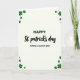 This greeting card features a centered St. Patrick’s Day message arranged in two levels, with “HAPPY” above and “HAVE A LUCKY DAY” below in dark emerald-green sans-serif lettering. Between them, “St. patrick’s day” appears in flowing black cursive, adding a gentle, intimate touch like a note shared between close friends. The text sits on a soft off-white background that keeps the focus on the message while feeling light and airy. In each corner, clusters of green shamrocks in mixed sizes tilt in different directions, creating a cozy frame that draws your eyes back to the middle 💚. Some clovers include slim stems while others are simple three-leaf shapes, as if they’ve been sprinkled around with care ☘️. Tiny star-like specks are scattered among the shamrocks, giving the corners a subtle sparkle. The overall layout is balanced and uncluttered, with the dark green and black lettering standing out clearly against the pale backdrop and the shamrocks forming a leafy border around the edges.