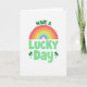 This card features a simple white background with a centered layout that feels friendly and upbeat 💚. At the top, “HAVE A” appears in a darker emerald green and curves gently, like it’s leaning in toward what comes next. Tucked right beneath that arc is a rainbow 🌈, stretching from red and orange through yellow, green, blue, and purple, like a bright bridge connecting the words above and below. Under the rainbow, “LUCKY DAY” sits in a lighter spring green, giving the message a softer, more welcoming look. Two small shamrocks in matching bright green sit on either side of “DAY,” like little companions framing the line and adding a quiet, close-knit touch ☘️. The flat shapes and crisp edges keep everything modern and uncluttered, with the greens and rainbow doing all the talking. The text is stacked in the center, with the curved top line, the rainbow band, and the straight “LUCKY DAY” line aligned neatly on the page. The shamrocks are evenly spaced beside “DAY,” and the rainbow’s arc mirrors the curve of “HAVE A” above it.