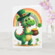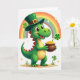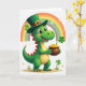 This card shows a cheerful green dinosaur standing on a bright white background, dressed in an emerald top hat with a small golden buckle for a St. Patrick’s Day look ☘️. Its big shining eyes and wide toothy grin, with a touch of rosy blush on its cheeks, make it feel like it’s smiling right at someone it adores. The dinosaur hugs a rustic brown pot packed with glowing gold coins, and a four-leaf clover peeks out as if it’s being offered like a lucky little gift 💚. Across the upper area, a soft pastel rainbow curves overhead while tiny star shapes sparkle around it. Near the top, the St. Patrick’s Day message sits above the character in green lettering that stands out clearly against the white space. Around the dinosaur’s feet, small shamrocks and a tiny orange heart add sweet, friendly details. Orange-tipped claws rest on a light sandy patch at the bottom, with the scattered icons floating close to the ground.