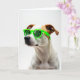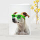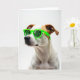 This card shows a close-up portrait of a Jack Russell Terrier posed against a bright white background, giving the scene a fresh, airy look. The dog’s white fur and tan ears are softly lit, and its slightly upward gaze feels like it’s looking fondly at someone just out of frame. Neon-green, heart-shaped sunglasses sit on its snout, adding a flirty, friendly St. Patrick’s Day twist 💚. In each lens, a small shamrock reflection appears, tying the look together with a crisp holiday detail ☘️. The smooth fur and the shiny plastic frames create a nice contrast in texture, with tiny whiskers standing out clearly. Along the top, “Happy St. Patrick’s Day” appears in green lettering, centered so it frames the dog’s face without crowding it. The background stays pure white, while the bright green glasses and shamrocks remain the sharpest color accents in the image.