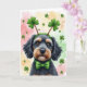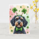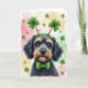 The front design shows a small dog, likely a terrier mix, facing forward with a charcoal-gray coat warmed by tan highlights and big brown eyes that feel inviting and a little shy. A bright green headband sits between its fluffy ears, topped with two upright four-leaf clovers ☘️, as if it dressed up just to be admired. An emerald-green bow tie at its neck adds a sweet, dressed-for-a-date touch, like it’s waiting patiently for a favorite person to smile back 💚. Behind the pup, soft watercolor washes blend blush pink, sunny yellow, and mint green, giving the scene a gentle springtime setting. Small shamrocks float across the background like confetti drifting through the air, keeping the mood light and affectionate. The St. Patrick’s Day greeting is placed near the top in green lettering that stands out against the pale colors without feeling loud. A smaller line of text sits near the bottom in a darker green, neatly spaced below the bow tie area. The clovers on the headband are a vivid green with simple leaf shapes, and a few tiny shamrocks dot the corners of the pastel backdrop.