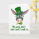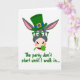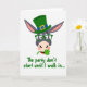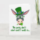 This card features a cartoon donkey’s head centered on a bright white background, drawn with sharp lines and soft shading that keeps the focus on its friendly face. The donkey wears an emerald-green leprechaun hat with a blue band and a small golden buckle, tilting slightly as if it just stepped into the room. Green-rimmed glasses frame its eyes, and a gentle pink blush on the cheeks gives it a flirty, buddy-next-door look 💚. A four-leaf clover ☘️ rests between its smiling teeth, adding a lucky touch and a hint of teasing confidence. Beneath the illustration, the phrase “The party don’t start until I walk in...” is set in green lettering, centered and easy to read. The contrast of grey fur, rich greens, and the white space makes the character pop without crowding the layout. The hat’s buckle is a small gold rectangle, and the clover’s four rounded leaves sit just below the donkey’s nose.