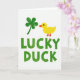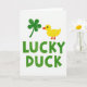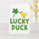 This design shows a rounded yellow duck with an orange beak, standing out against a white background and turning one shiny black eye toward a four-leaf clover 💚. The clover sits up in the upper left, painted in deep green with small texture changes in each leaf that make it feel gently imperfect. The duck’s soft shape and attentive gaze give the scene a sweet, friendly closeness, like it’s quietly admiring a lucky charm meant for someone special. Beneath them, the words “LUCKY DUCK” appear near the lower center in rich green letters that look brushed on, with slightly uneven edges. The open white space around the duck and clover keeps the focus on their simple pairing and makes the greens and yellow stand out. A small touch of St. Patrick’s Day cheer comes through in the clover’s classic shape and the green lettering ☘️. Share St. Patrick’s Day feelings with someone you care about. The duck is bright yellow, the clover is emerald green in the upper left, and “LUCKY DUCK” is set below in dark green.