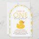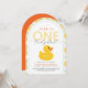 Celebrate a sweet milestone with this cheerful Lucky Duck first birthday invitation featuring a modern arch design and an adorable duck illustration. Soft pastel yellow and blue tones create a joyful, gender-neutral look that’s perfect for a first birthday celebration.