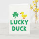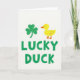 On the front of the card a white background sets a calm, open space for two simple icons that feel like they belong together. On the left sits an emerald green shamrock with three rounded leaves, lightly textured as if colored in with a crayon, and it seems to lean toward the character beside it. On the right is a sun-yellow duckling with a small black eye, an orange beak, and orange webbed feet, facing left as though it’s sharing a shy little glance with the clover 💚. Beneath them, the words “LUCKY DUCK” are centered across two lines in green, with slightly uneven fill that gives the letters a friendly, human touch. The spacing between the art and the text keeps everything airy and easy to read, like a sweet note left on a kitchen table. The green and yellow pairing feels cozy and affectionate, like a quiet inside joke between close friends ☘️. Share St. Patrick’s Day sentiments with someone special.