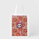 I own a lot of reusable grocery bags, but this one holds its box shape and simply stands up on its own even if there is nothing in it. Its stiffer than your regular reusable bag too, and the material is water resistant. I poured water on the exterior and it didn't penetrate inside to the other side. I'm buying a couple more. Wish I knew how durable these bags were or I would have purchased a few more with my initial order. I also like how it folds and buttons up when not in use, making it easy to put into a handbag or luggage. I haven't used this bag yet, as I purchased it for travel use, like when you're at the airport and need to small sturdy bag to place any airport purchases in, like food, souvenirs etc. I can tell you when you first see this bag, it looks very cheap, but after closer inspection of the material and the seams its a very sturdy reusable bag. I tested it out by putting some really heavy objects inside and I could not observe any stress to the bag at all. Another thing I like about it, is the fact the medium size that this is makes it easy to just carry it in your hand without the bottom of the bag scraping the ground, like most other bags do when you're short. That alone, deserves 5 stars. I just wish there were more colors to choose from! The PDX Airport Carpet printing looks just like the photo, and using this bag during travel might be a conversation piece when/if a native from Oregon happens to see it.