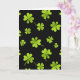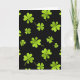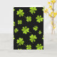This greeting card features a repeating pattern of four-leaf clovers drifting across a deep black background, like tiny tokens passed between close friends 💚. Each clover is chartreuse green with soft shading that gives the leaves a gentle curve, as if they’re floating just above the surface. The clovers vary in size and tilt slightly in different directions, creating an easy, relaxed rhythm across the tall layout. Some sit closer together like a quiet pair leaning in, while others leave a little space, like an unspoken pause that still feels connected. There’s no character figure here, but the heart-shaped leaflets and the way the clovers seem to gather and separate can read like a small, affectionate dance ☘️. No greeting text appears on the front, leaving the pattern to do all the talking with color and contrast. The overall look is a field of luminous green clovers scattered from top to bottom against a velvety black backdrop.