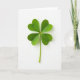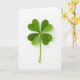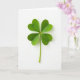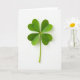 This card features a four-leaf clover centered on a bright white background, with each leaf spreading out like four small hearts leaning toward one another 💚. The green shifts from light chartreuse near the edges to deeper emerald toward the veins, adding depth and a gentle, close-knit feel, as if the leaves are drawn together in a quiet embrace. Soft, diffused light falls across the clover and creates a faint shadow beneath it, giving the stem and leaves a subtle lift from the page. The setting stays simple and airy, letting the clover’s fine vein patterns stand out like delicate filigree. A short St. Patrick’s Day greeting appears near the top in green text, leaving plenty of open space around the image. A smaller line of text sits near the bottom in a lighter green, balanced evenly under the stem ☘️. The clover’s slender stem angles slightly downward, and the tiny shadow pools just to one side on the white surface.