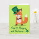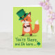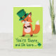 This design shows a cute cartoon fox standing upright with warm orange fur, cream on its belly and tail tip, and little paws held together as if it’s gathering courage to speak. Its big black eyes and small smile aim forward with a tender, friendly look that feels like it’s meant for someone special 💚. A tall emerald-green top hat sits on its head, finished with a black band and a gold buckle that catches the eye. The background is a flat lime green field that keeps everything bright and focused on the fox. Beneath the character, dark green text reads “You’re there, and I’m here...” with the words centered near the bottom. A small three-leaf clover ☘️ appears as a punctuation mark, tucked alongside the line to echo the St. Patrick’s Day theme. The simple shapes and smooth edges give the scene a modern, graphic look, with the fox’s hat and tail creating the strongest contrast against the green backdrop. The clover sits right after the ellipsis, and the dark green lettering stands out clearly against the lime green background.