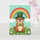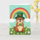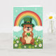 This design shows a friendly woodland creature standing in the center, with warm brown fur, a lighter belly, rosy cheeks, and bright eyes that seem to linger on you like an affectionate hello. It wears an emerald green top hat with a gold buckle and holds a three-leaf clover close to its chest 💚. Behind it, a light teal sky sets a calm backdrop while a wide rainbow curves overhead, framed by soft white clouds and tiny white stars 🌈. The creature stands on a rolling green hill dotted with white daisies with sunny yellow centers and scattered shamrocks, adding little touches of spring all around. The overall scene feels like a sweet moment shared between friends, shown through the character’s open smile and the gentle way it hugs the clover. A short St. Patrick’s Day message sits near the top in green lettering, balanced neatly above the character. Small clover shapes and daisy petals are sprinkled across the foreground, with the rainbow arching high above the hill.