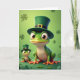 Designed with two friendly, human-like frogs in leprechaun top hats, this St. Patrick’s Day card sets a sweet, cozy scene. The larger frog sits in front with glossy emerald skin and wide, curious eyes, while the smaller frog lingers just behind, angled close as if keeping a trusting, affectionate watch. Both hats are bright green with a gold buckle, adding a festive touch that frames their faces and draws you into their gentle connection 💚. Their creamy bellies and coral-orange webbed feet warm up the cooler greens, and the soft lighting lays down mild highlights along their rounded cheeks and shoulders. The background is a lime-green gradient sprinkled with faint shamrock shapes, keeping the focus on the pair without feeling busy ☘️. A short St. Patrick’s Day greeting sits near the top in a light, pale-yellow tone, with a smaller line beneath it in deeper green for contrast. Share St. Patrick’s Day sentiments with someone you care about, and enjoy the subtle shamrocks drifting across the green backdrop behind the frogs.