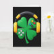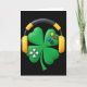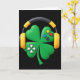 This card features an emerald-green four-leaf clover centered on a deep black background, shaped into the face of a modern game controller ☘️. A pair of headphones sits like a crown on top, with golden-yellow earcups and a dark charcoal band hugging the upper leaves. On the lower-left leaf, a white directional pad is set in neatly, its arrows angled like they’re ready for the next move. On the lower-right leaf, four round action buttons—yellow, blue, red, and black—add a lively splash of color against the green 💚. Soft shading along the clover and the headphones gives everything a smooth, matte-plastic look, like something you’d want to hold close and share with a favorite gaming partner. The design keeps the focus tight, with the bright shapes standing out sharply against the dark backdrop and no extra scenery to distract. The only text appears small near the bottom in white, tucked beneath the clover on the black field.