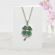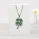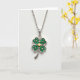 This card features a sterling silver four-leaf clover pendant centered on a bright white background, with a delicate silver chain draped above it. Each heart-shaped leaf is set with small, domed emerald-green stones that catch the light in a soft glow, giving the clover a lush, textured look 💚. At the meeting point of the four leaves sits a tiny raised gold heart, like a quiet sign of affection nestled into the design ☘️. The gentle lighting brings out the cool shine of the metal and the rich green sparkle of the gemstones without harsh shadows. A short St. Patrick’s Day message appears near the top in green lettering, with a smaller line beneath it in a lighter green. The pendant remains the main focus, framed by open white space that keeps everything airy and uncluttered. The silver links and the clover’s polished edges are crisp against the white field, with the gold heart standing out at the center.