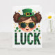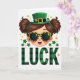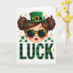 Designed with an animated girl’s head and shoulders as the focus, this St. Patrick’s Day card shows her brown pigtails framing a partly hidden face and a wide, open smile that feels like it’s aimed at a close friend 💚. A classic green leprechaun hat sits at a jaunty angle on top, finished with a gold buckle and a small four-leaf clover ☘️. Oversized sunglasses with a leopard-print frame cover her eyes, adding a flirty, fashion-forward twist to the Irish theme. The setting stays simple with a bright white background, letting the greens, browns, and yellows stand out clearly. Beneath her, the word “LUCK” is placed in large plaid-patterned letters in green and black, centered and easy to read. Around both the girl and the text, small green shamrocks and yellow starburst shapes are sprinkled like confetti. Share St. Patrick’s Day sentiments with someone who makes you grin.