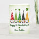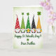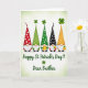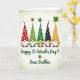 This card shows five gnomes standing shoulder to shoulder in a neat row, their tall cone hats and long white beards filling the center like close friends leaning in for a photo 💚. The hats move through red with white dots, several shades of green with stripes and spots, a black hat with white accents, and a warm yellow hat that adds a sunny note. Most of the hats are topped with little four-leaf clovers, and a larger clover sits centered below them like a shared lucky charm ☘️. One gnome holds a shiny golden mug, another lifts green-and-yellow balloons as if offering them to someone just out of frame, and a third presents a small pot of gold with a proud, affectionate tilt. Behind them, a pale green-to-white gradient keeps the scene light and airy, making the hats and props stand out. Under the gnomes, the message “Happy St. Patrick’s Day!! Dear Brother,” is placed near the bottom in flowing dark green lettering. The final detail is the big clover directly beneath the middle gnomes, anchoring the lineup against the softly fading background.