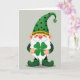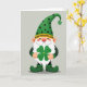 This card features a friendly St. Patrick’s Day gnome centered on a soft gray background, dressed in deep emerald and forest greens that feel cozy and inviting 💚. A long white beard flows down his front, and his rosy cheeks and round red nose give him a sweet, approachable look, as if he’s leaning in to share a private joke with a close friend. His tall green hat curves to one side, dotted with small black polka dots and topped with a four-leaf clover ☘️. A gold hatband with a black geometric pattern wraps around the base of the hat, adding a neat accent above his face. In his gloved hands, he holds an oversized four-leaf clover forward like a gentle offering, drawing your eye to the center. The greeting text sits above the gnome in green lettering, with a smaller line below in a darker green that balances the layout. Dark green sleeves and rounded, bulb-like shoes anchor the figure at the bottom, with soft shading that gives the illustration a smooth, layered look.
