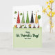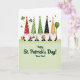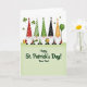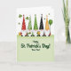 This greeting card shows five gnomes lined up across the top, their tall cone hats forming a cheerful row of patterns and colors—red with gold dots, green-and-white stripes, deep green with white snowflakes, black with silvery speckles, and orange-and-white bands. Below each hat, a big white beard frames a tiny rosy nose, and the gnomes lean close as if sharing a friendly joke. A few of them hold St. Patrick’s Day treasures like a gold tankard, a green pipe, and a small pot of gold, while the last gnome keeps hold of a green balloon string ☘️. Shamrocks in several shades of green float around them, filling the space with little bursts of motion 💚. The background is a soft light-green gradient that keeps the scene airy and bright. The message “Happy St. Patrick’s Day! Dear Dad” sits prominently beneath the gnomes in a dark green, flowing style, centered so it reads clearly. Small shamrocks scatter around the text and along the open background, with the balloon rising near the right side of the lineup.