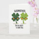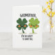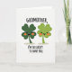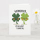 This card features two smiling shamrocks standing close together inside a white circular frame, like friendly companions sharing a quiet moment ☘️. The left shamrock is a deeper emerald green, while the right one is a lighter lime green, and their matching crescent eyes and wide grins make them look warmly connected. Each has rosy orange cheeks that add a gentle contrast against the greens, as if they’re blushing at the sweet company. A faint pale beige shadow beneath them suggests they’re resting on a simple, open surface with plenty of breathing room. Centered above the pair, the word “GODMOTHER” appears in an easy, hand-drawn sans-serif style in green, spaced evenly across the top of the circle. Centered below them, the line “I’M SO LUCKY TO HAVE YOU” is set in the same green, creating a tidy top-and-bottom layout 💚. The background stays uncluttered and bright, keeping the two shamrocks and their green lettering as the main focus within the crisp white circle.