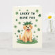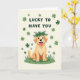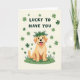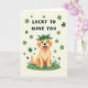 This card features a golden retriever puppy sitting on an oval patch of green grass against a soft cream background, looking up with wide, bright eyes and a happy open mouth with a pink tongue peeking out 💚. A leafy green wreath rests around its head like a little crown, giving it a sweet, affectionate look, as if it’s posing for someone it adores. Above the puppy, the words “LUCKY TO HAVE YOU” sit centered near the top in deep emerald-green letters. Small four-leaf clovers in mixed green tones drift around the text and across the open space, some tilted as though they’ve just floated into place ☘️. The gentle greens and warm golden fur create a cozy, friendly scene that feels like a quiet moment shared between close friends. The puppy’s posture is upright and eager, as if it’s waiting for a kind word or a pat on the head. The clovers are scattered in different sizes around the upper half of the design, with a few sprinkled near the puppy and grass.