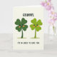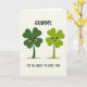The front design shows two anthropomorphic four-leaf clovers standing close together on a soft, creamy background, their bodies angled as if leaning in like close friends. The clover on the left is a deeper forest green, while the one on the right is a bright lime green, creating a gentle contrast that still feels like a matched pair 💚. Each has big black eyes, small upturned smiles, and orange blush spots on their cheeks that make their shared look feel sweet and affectionate. Small, pale green oval shapes sit beneath them like simple ground shadows, keeping the scene lightly anchored. At the top, “GRAMMY.” appears in large, dark green serif letters, centered and easy to spot. Beneath the clovers, the line “I’M SO LUCKY TO HAVE YOU.” is set in matching dark green, centered and spaced to frame the characters ☘️. The greens and warm orange accents stand out against the creamy backdrop, with the two clovers’ rosy cheeks and tiny smiles as the clearest focal details.