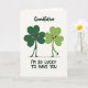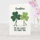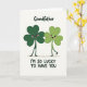 This St. Patrick's Day card shows two smiling shamrocks centered on a creamy white background, leaning close as if sharing a quiet joke 💚. The left clover is a deeper emerald green with wide, bright eyes, rosy cheeks, and a big grin that feels directed straight at its companion. The right clover is a lighter lime green with soft eyelashes and a gentle tilt inward, their rounded leaves nearly touching to suggest closeness. Subtle shading on each leaf adds depth while keeping the scene airy and uncluttered. Above the pair, the word “Grandfather” sits in green lettering, easy to spot without crowding the illustration. Beneath them, “I’M SO LUCKY TO HAVE YOU” appears in matching green, lined up neatly under their faces with a friendly, even spacing ☘️. The two clovers stand side by side in the center, framed by plenty of open space and smooth, softly shaded green leaves.